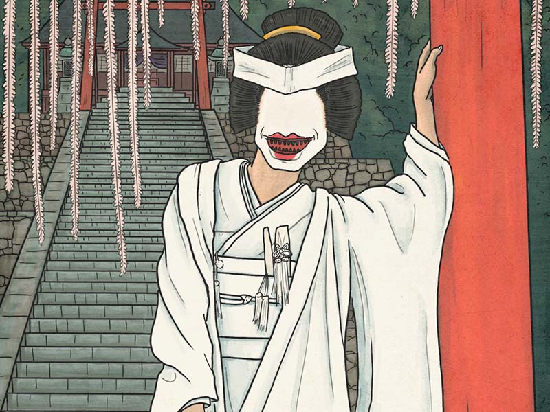 Late at night, a disturbing yōkai dressed in beautiful wedding clothes can be seen loitering near temples and shrines. She calls single young men over to her, and they are seldom able to resist her charms.